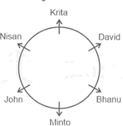 | Question | Six friends, David, Bhanu, Minto, Krita, John and Nisan, are sitting in a circle with their backs towards the centre. David and Minto are sitting to the immediate left and right of Bhanu, respectively. John is not sitting to the immediate left of David. Nisan is sitting third to the right of Bhanu. Who is sitting second to the left of Bhanu? | |