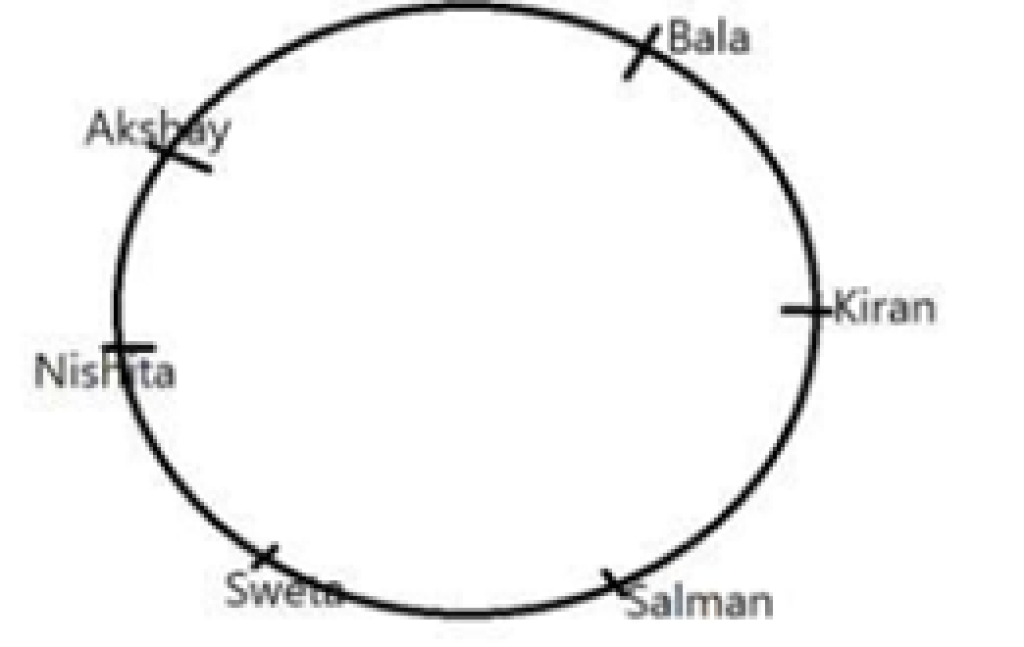 Six students are sitting around a circular table facing the centre. Salman is an immediate neighbour of both Kiran and Shwetha. Bala is sitting second right to Salman. Shwetha is sitting third to the left of Bala. Akshay is an immediate neighbour of both Bala and Nishitha. Who is the immediate neighbour of Nishitha and Salman?