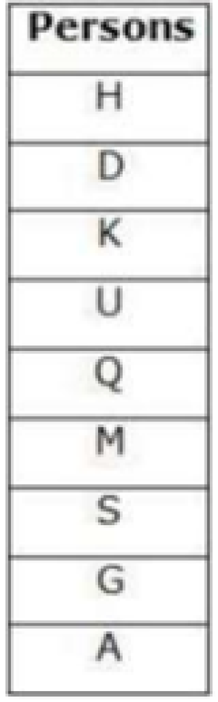Nine persons A, D, G, H, K, M, Q, S and U are standing in a school assembly prayer one after another but not necessarily in the same order. Only three persons stand between U and G. M stands two persons after U. Only two persons stand between M and A, who stands after G. S stands two persons before A.