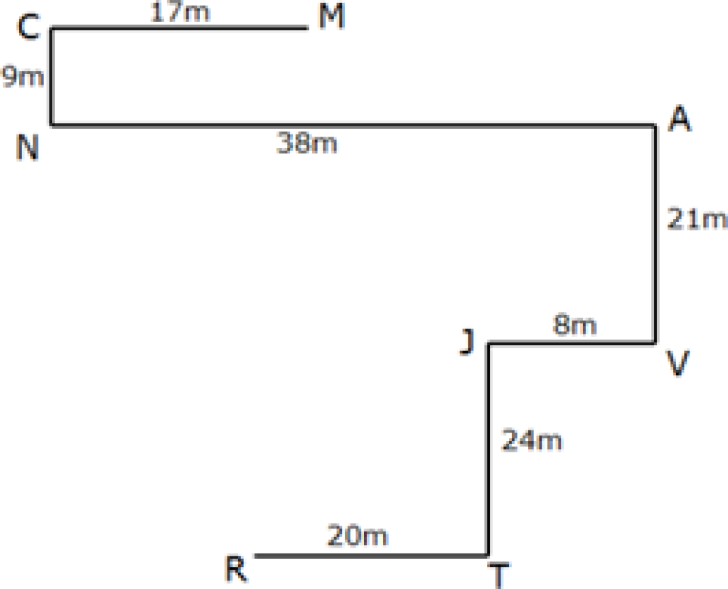 Study the following information carefully and answer the questions given below. Eight players are standing in the stadium at some distance. Player N is 38m to the west of player A.Player T is 20m to the east of player R. Player J is 24m to the north of player T. Player N is 9m to the south of player C. Player V is 8m to the east of player J. Player C is 17m to the west of player M. Player A is 21m to the north of player V. What is the shortest distance between the players R and A?