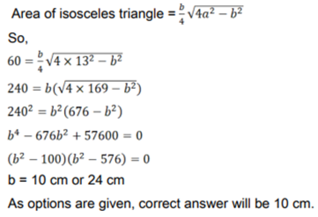 The area of an isosceles triangle is 60 and the length of each one of its equal sides is 13 cm. Find its base.