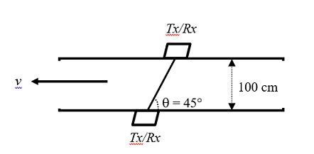 Q. The average velocity v of flow of clear water in a 100 cm (inner) diameter tube is measured using the ultrasonic flow meter as shown in the figure. The angle q is 45°. The measured transit times are t1 = 0.9950 ms and t2 = 1.0000 ms. The velocity v (in m/s) in the pipe is (up to one decimal place) _.