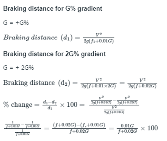 Q. The coefficient of average rolling friction of a road is fr and its grade is +G%. If the grade of this road is doubled, what will be the percentage change in the braking distance (for the design vehicle to come to a stop) measured along the horizontal (assume all other parameters are kept unchanged)?