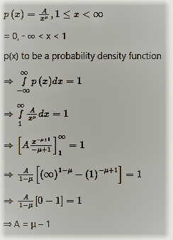 Q. The function ๐(๐ฅ) is given by ๐(๐ฅ) = ๐ด/๐ฅ๐ where ๐ด and ๐ are constants with ๐ > 1 and 1 โค ๐ฅ < โ and ๐(๐ฅ) = 0 for โโ < ๐ฅ < 1. For ๐(๐ฅ) to be a probability density function, the value of ๐ด should be equal to