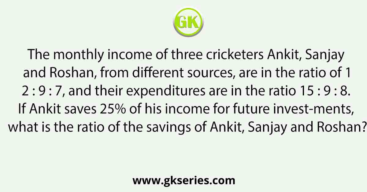 | Question | The monthly income of three cricketers Ankit, Sanjay and Roshan, from different sources, are in the ratio of 12 : 9 : 7, and their expenditures are in the ratio 15 : 9 : 8. If Ankit saves 25% of his income for future investments, what is the ratio of the savings of Ankit, Sanjay and Roshan? | |