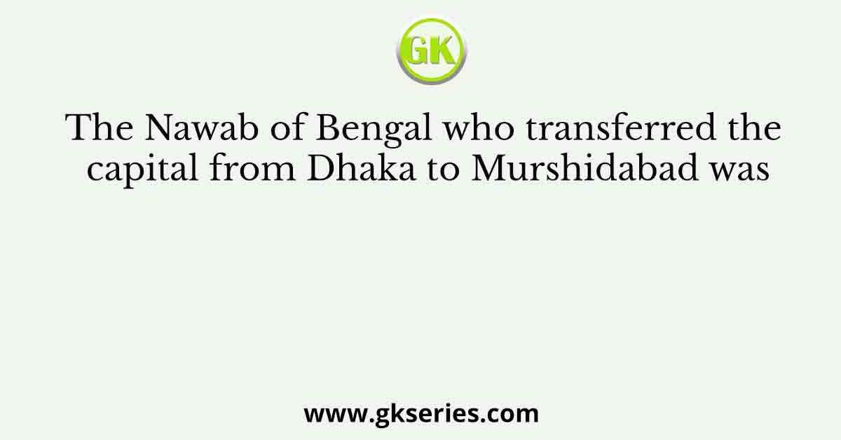 Explanation: The Nawab of Bengal who transferred the capital from Dhaka to Murshidabad was (c) Murshid Quli Khan.