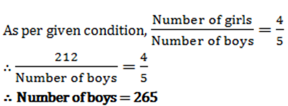 Home » quantitative aptitude » The ratio of numbers of girls and boys participating in sports of a school is 4:5. If the number of girls is 212, determine the number of boys participating in the sports.