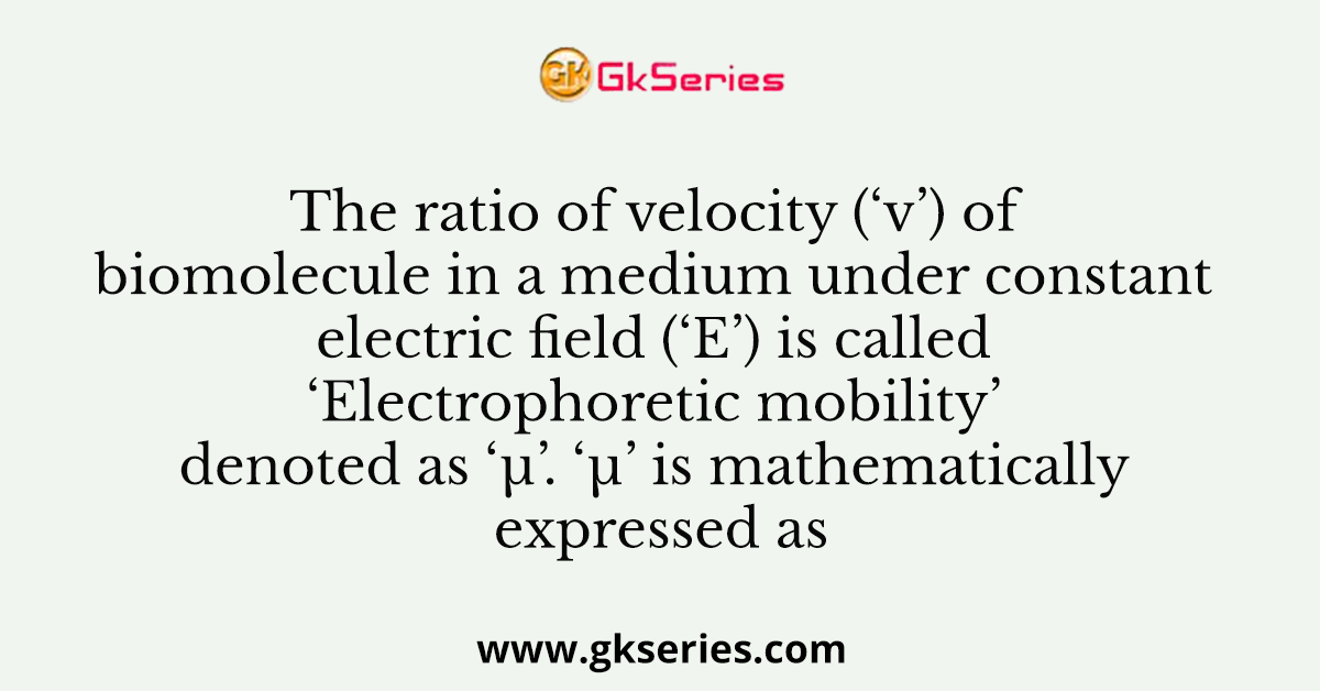 The ratio of velocity (‘v’) of biomolecule in a medium under constant electric field (‘E’) is called ‘Electrophoretic mobility’ denoted as ‘µ’. ‘µ’ is mathematically expressed as
