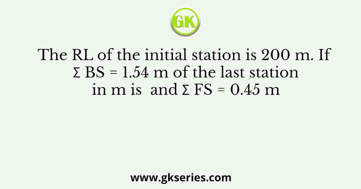 Q. The RL of the initial station is 200 m. If Σ BS = 1.54 m of the last station in m is  and Σ FS = 0.45 m , then the RL.