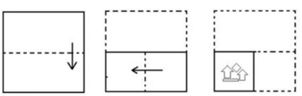 The sequence of folding a piece of paper and the manner in which the folded paper has been cut is shown below