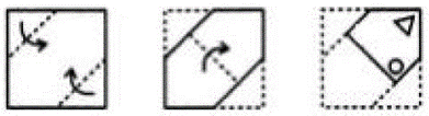 The sequence of folding a piece of paper and the manner in which the folded paper has been cut is shown in the following figures. How would this paper look when unfolded?