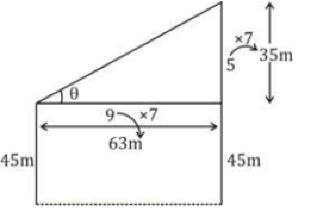 The tops of two poles of height 80 m and 45 m are connected by a rope. If the rope makes an angle with the horizontal whose tangent is 5/9, then what is the distance (in m) between the two poles?