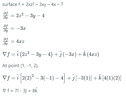 Q. The vector that is normal to the surface 2x z2 – 3x y – 4 x = 7 at the point (1, –1, 2) is