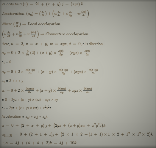 Q. The velocity field in a flow system is given by ๐ฃ = 2๐ข + (๐ฅ + ๐ฆ)๐ฃ + (๐ฅ๐ฆ๐ง)๐ค. The acceleration of the fluid at (1, 1, 2) is
