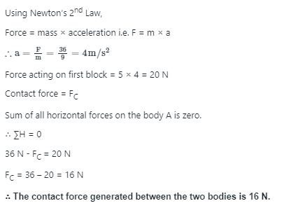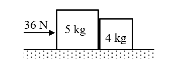 Q. Two rigid bodies of mass 5 kg and 4 kg are at rest on a frictionless surface until acted upon by a force of 36 N as shown in the figure. The contact force generated between the two bodies is