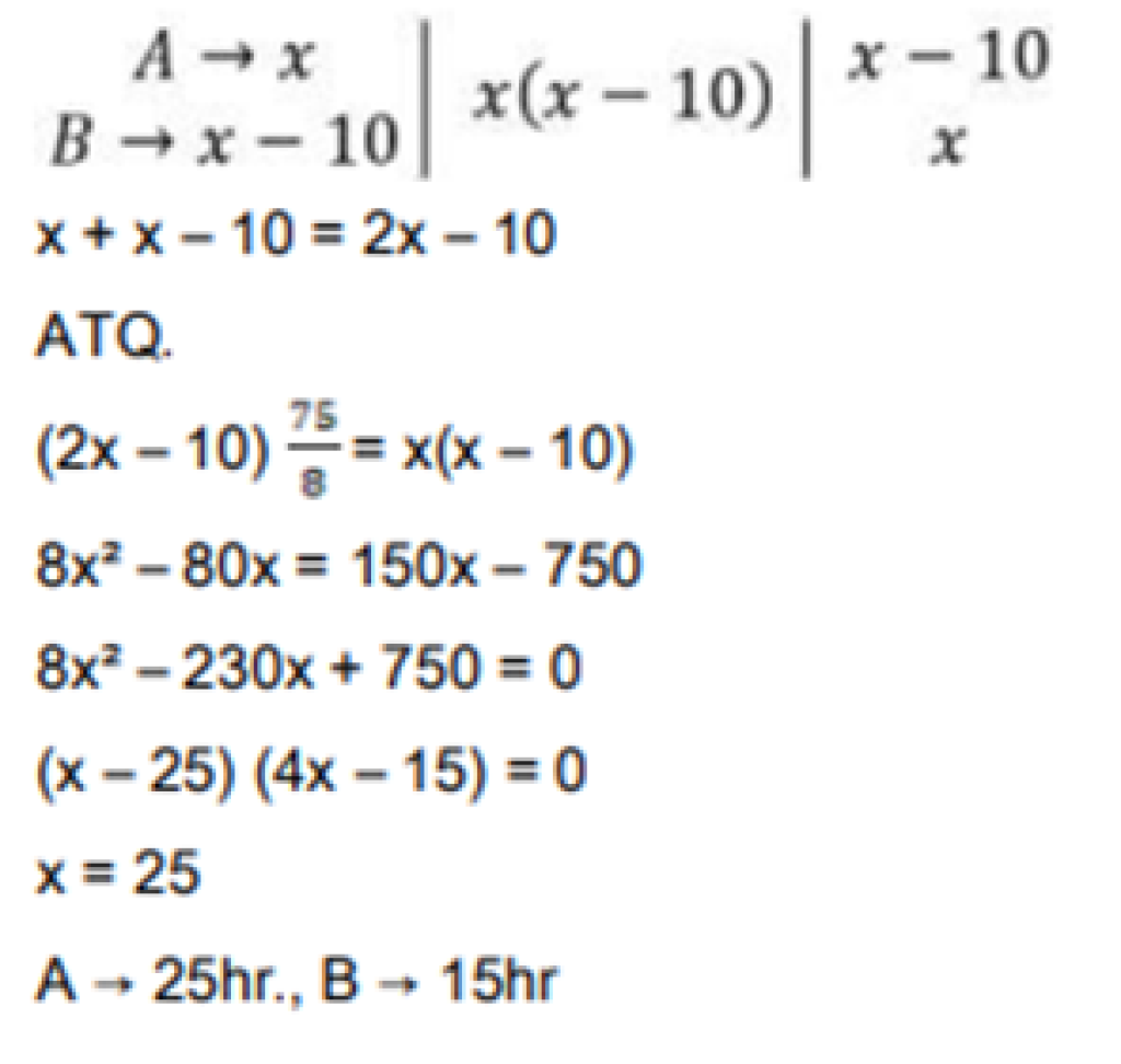 Home » quantitative aptitude » Two water taps together can fill a tank in 75/8 hr. the tap of larger diameter takes 10 hours less than the smaller one to fill the tank separately