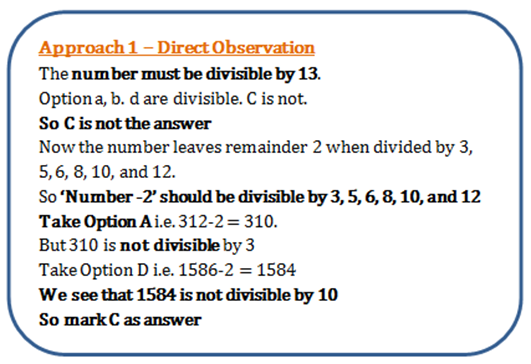 Home » quantitative aptitude » What is the least number which when divided by the numbers 3, 5, 6, 8, 10 and 12 leaves in each case a remainder 2 but which when divided by 13 leaves no remainder?