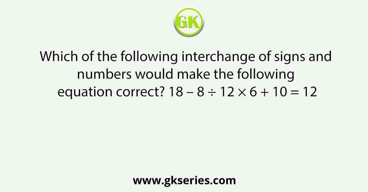 | Question | Which of the following interchange of signs and numbers would make the following equation correct? 18 – 8 ÷ 12 × 6 + 10 = 12 | |