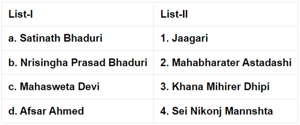| Solution | Satinath Bhaduri received Rabindra Smriti Puraskar in 1950 for novel ‘Jaagari’. Nrisinghaprasad Bhaduri received Sahitya Akademi Award in 2016 for his essay ‘Mahabharater Astadashi’. Mahasweta Devi received Jnanpith Award in 1996 for writing in Inidan languages in the Eighth Schedule of the Indian Constitution. Afsar Ahmed received Sahitya Akademi Award in 2017 for his novel ‘Sei Nikonj Manusta’. | |