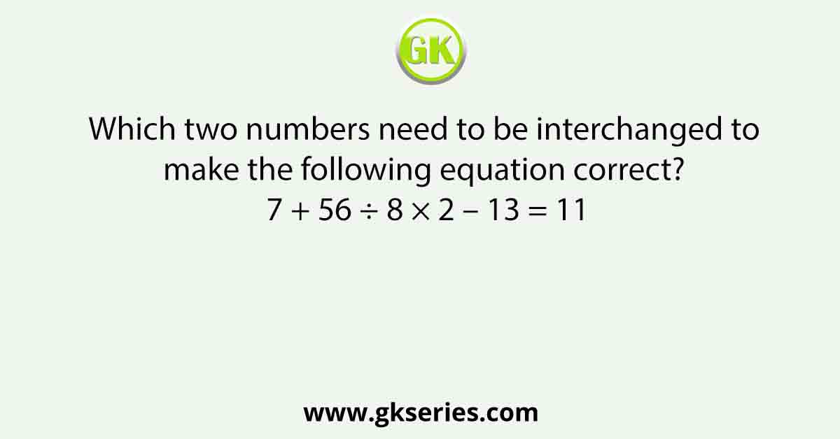 | Question | Which two numbers need to be interchanged to make the following equation correct? 7 + 56 ÷ 8 × 2 – 13 = 11 | |