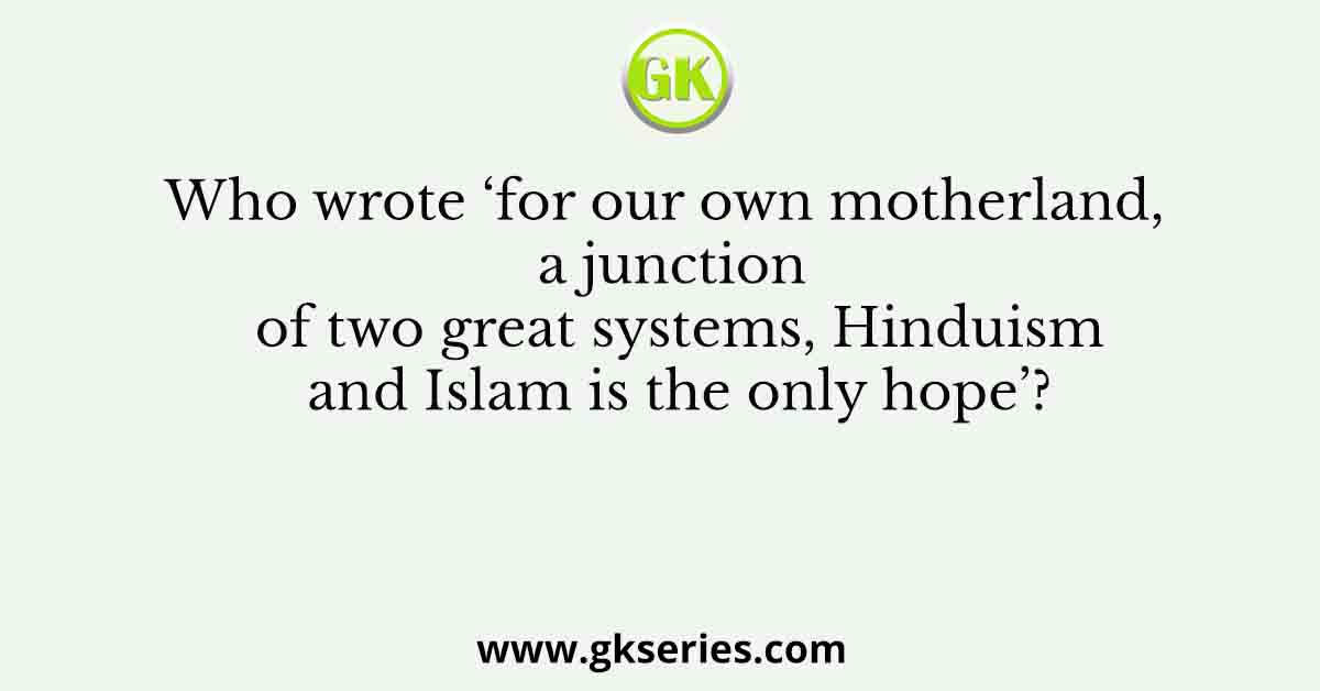 Q. Who wrote ‘for our own motherland, a junction of two great systems, Hinduism and Islam is the only hope’?